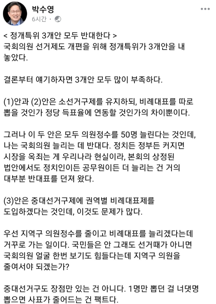 박 의원도 같은 날 자신의 사회관계망서비스(SNS)를 통해 "정개특위 1안은 '소선거구제 + 권역별·병립형 비례대표제', 2안은 '소선거구제 + 권역별·준연동형 비례대표제'로 둘 다 비례대표 의원 수가 50명 늘어난다"면서 "3안은 '도농복합형 중대선거구제 + 권역별·병립형 비례대표제'로 의원 수는 유지되지만 지역구 의원 수는 줄고 비례대표 의원 수는 늘어나고, 선거구 크기가 커진다"고 설명했다.