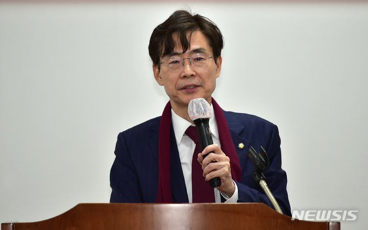 국민의힘 조경태 의원이 23년 3월 20일 국회 소통관 기자회견장에서 국회의원 50명 증원 결사 반대 기자회견을 하고 있다. 촬영편집.권민구 기자