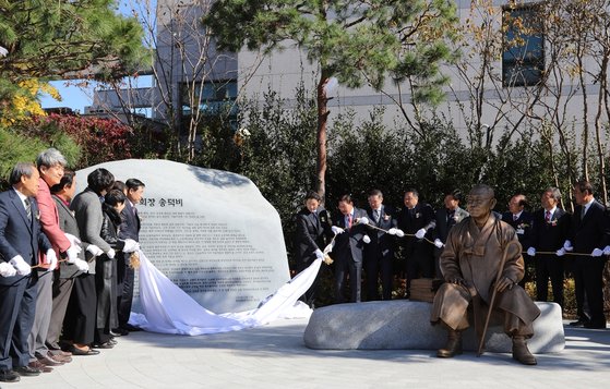 2019년 11월 경남 함안군 군북면 신창마을에서 열린 효성그룹 창업주 조홍제 회장 송덕비 제막식 현장. 이날 조 회장의 생가도 개방됐다. [사진 함안군]