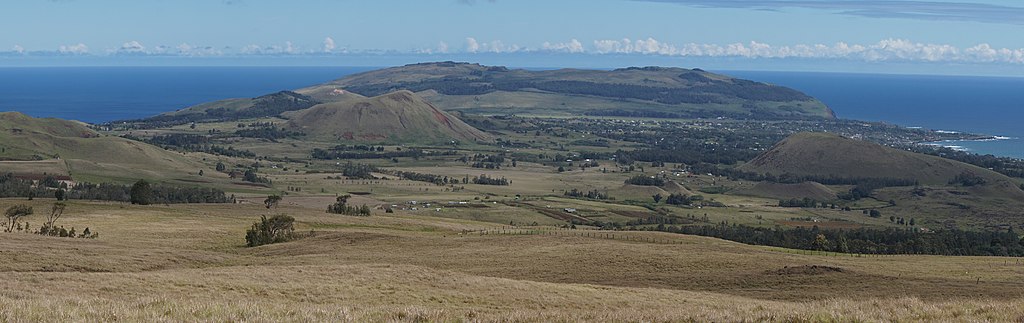 Typical landscape on Easter Island; rounded extinct volcanoes covered in vegetation. This is the view from Puna Pau, the quarry for the "hats" of the Moai stone statues on the island. To get a grasp on the scale of things, notice the horses grazing at the top of the hill.