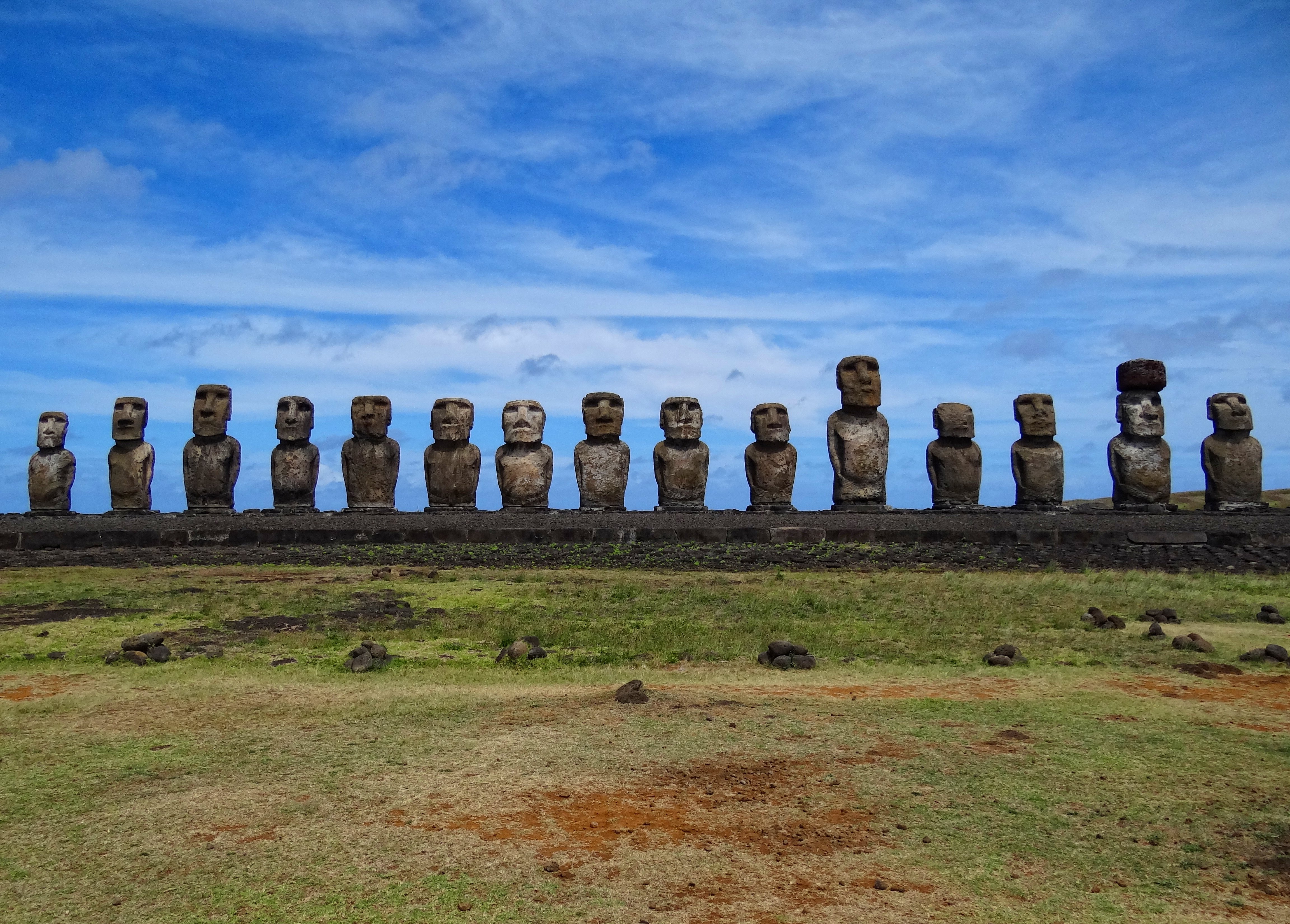 All fifteen standing moai at Ahu Tongariki, excavated and restored in the 1990s