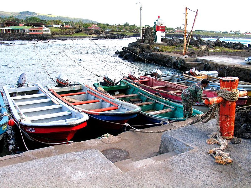 Osterinsel, Hanga Roa Hafen mit Moai Ko te Riko
